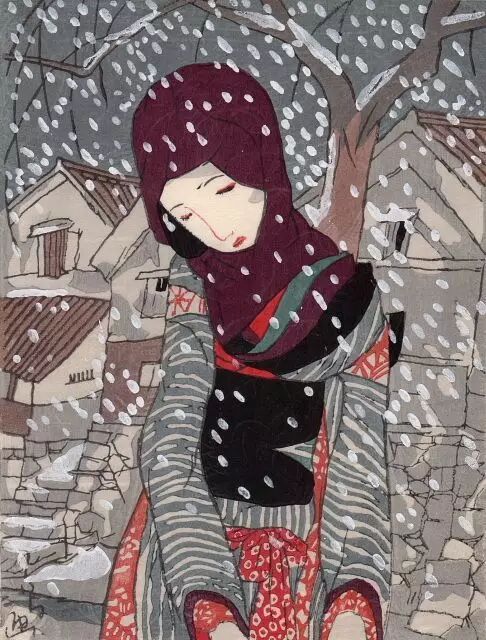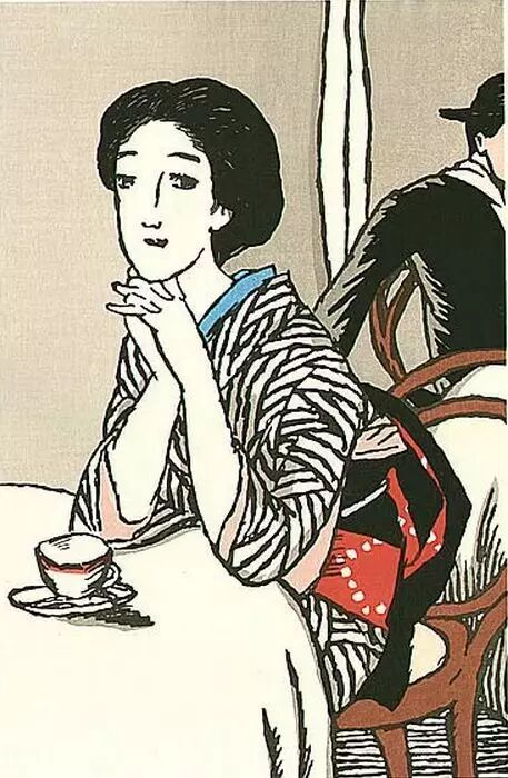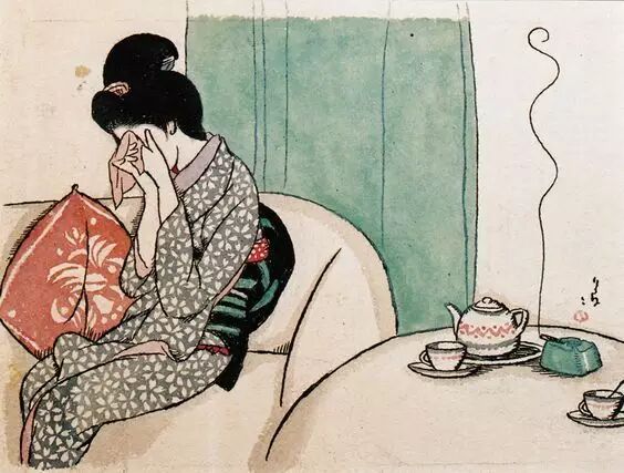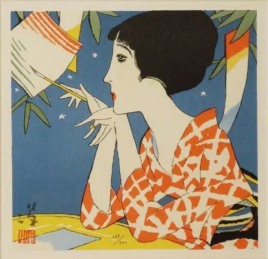 竹久梦二的绘画,创立了属于传统日本美人画之外的个人美学,这样的美学,不仅来自于他引入西洋体积感,抽象简练的绘画手法,更来自他忧愁悲悯的诗人心。他笔下的女性,不再是只会梳妆打扮的玩物,而是会抽着烟,喝着咖啡,写着情书的真女子。