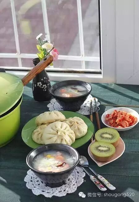 11、提前包好的白菜粉条馅包子,鲜虾滑玉米粥,辣白菜,还有水果猕猴桃!