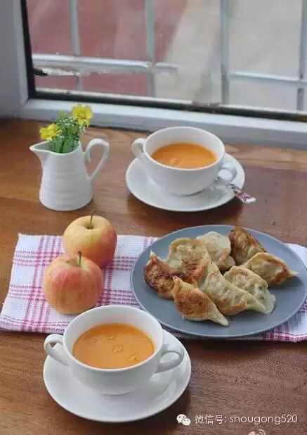 4、前一天晚上剩的芹菜肉和韭菜鸡蛋馅的饺子,早起用油煎了,晚上睡觉前抓一把大米泡上南瓜切小块,早起用豆浆机做的南瓜米糊,还有小苹果!