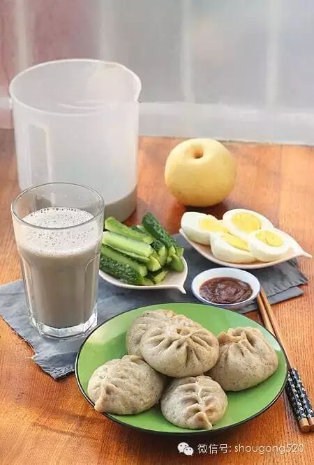 14、平时打豆浆过滤出来的豆渣都冷冻保存,用来放到馒头包子中,这样既不会浪费又有营养,昨晚做的芹菜肉黑豆渣包子,芹菜茎叶全部留下洗净没有焯直接切成末放入肉馅中,这样营养一点不流失,而且芹菜味浓;早上又打了黑豆浆,还有煮蛋,黄瓜蘸酱!