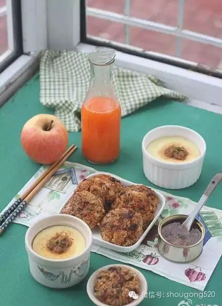 20、蒸了鸡蛋羹,将昨天做肉夹馍剩的酱肉取出一小块切成末放点酱肉汤和葱花煮开用少许淀粉勾芡做成汁浇在蛋羹上;剩米饭蒸锅热透放入葱末、胡萝卜末、黄瓜末、再放入自制肉松和拌饭酱 拌匀后用保鲜膜做成团再轻轻一压就成了酱香米饼;果汁是苹果胡萝卜汁放了一些纯净水和蜂蜜!