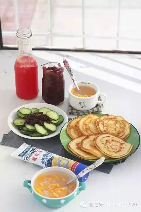 18、晚上睡觉前将面糊和好早晨已发酵好,做了超级松软的玉米饼(放了一个鸡蛋和一大勺奶粉),抹自己熬的果酱或者蓝莓炼乳、奶酪吃;煮了红薯粥;拌了小黄瓜;水果是鲜榨的西瓜汁!