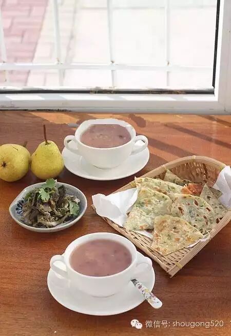 10、昨晚的剩米饭锅底,加了水,又放了2个冻在冰箱里准备包豆包的红豆馅,于是10分钟后就做好了红豆粥;冷藏里还有一块剩的烫面团,于是烙了3张薄葱油饼,水果是大头梨;也可以将葱油饼擀好冷藏在冰箱里,早晨拿出上锅一烙就好!