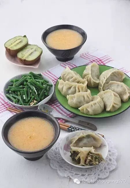 5、剩了1把油菜,晚上热水焯了一下再加上粉丝和肉末葱花,早晨起来包了10多个烫面蒸饺,烫面是烙葱油饼剩的冷藏在冰箱里的;剩米饭锅底放了一块切碎的南瓜加水用豆浆机做的南瓜米糊;凉拌豇豆;一个猕猴桃,切开。