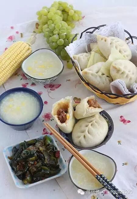 16、玉米鲜肉包、玉米大米粥、油黄瓜小菜,葡萄,肉包和小咸菜。