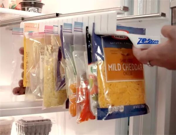 冰箱或橱柜的空间有限,要怎样才能最有效地收纳,真是让人烦恼!尤其用夹链袋的收纳,又占空间,又怕里面的东西掉出来。所以 Zip n Store 提供了最佳收纳夹链袋的解决方法,只要将吊挂收纳器装在冰箱上,就能一一将夹链袋排排夹住站好啦。