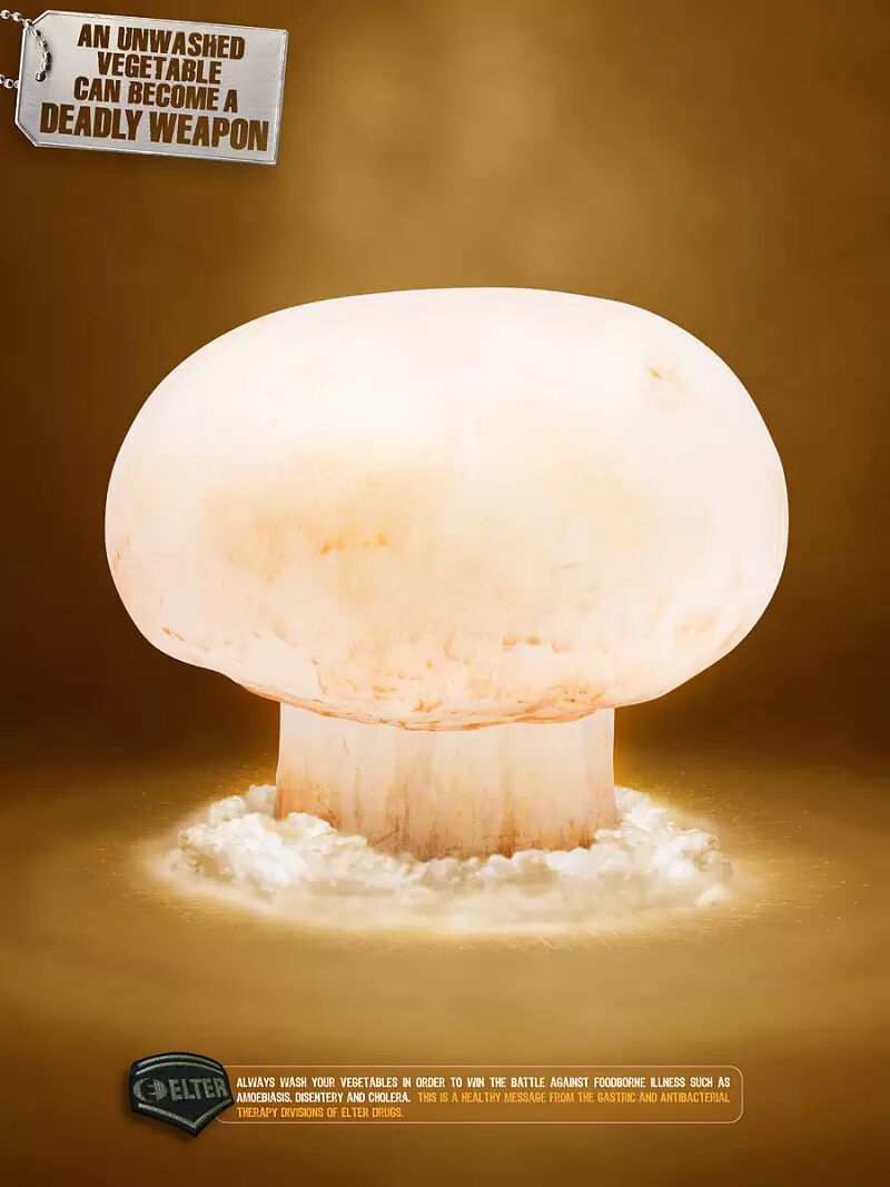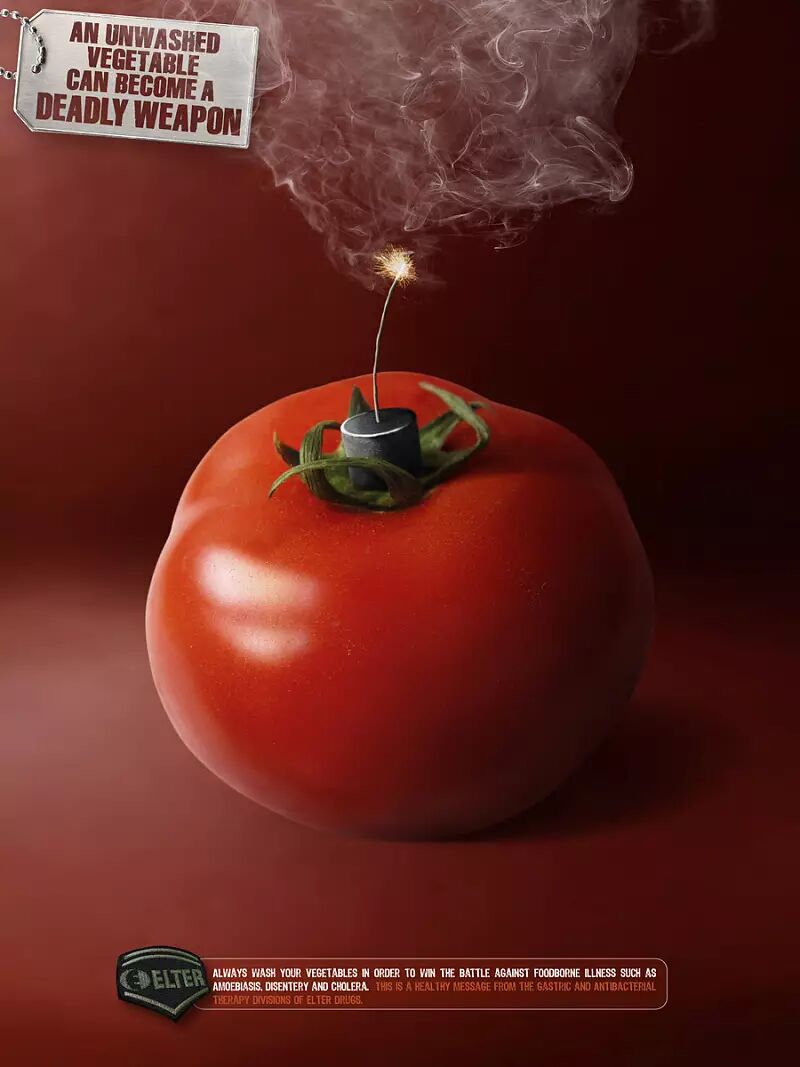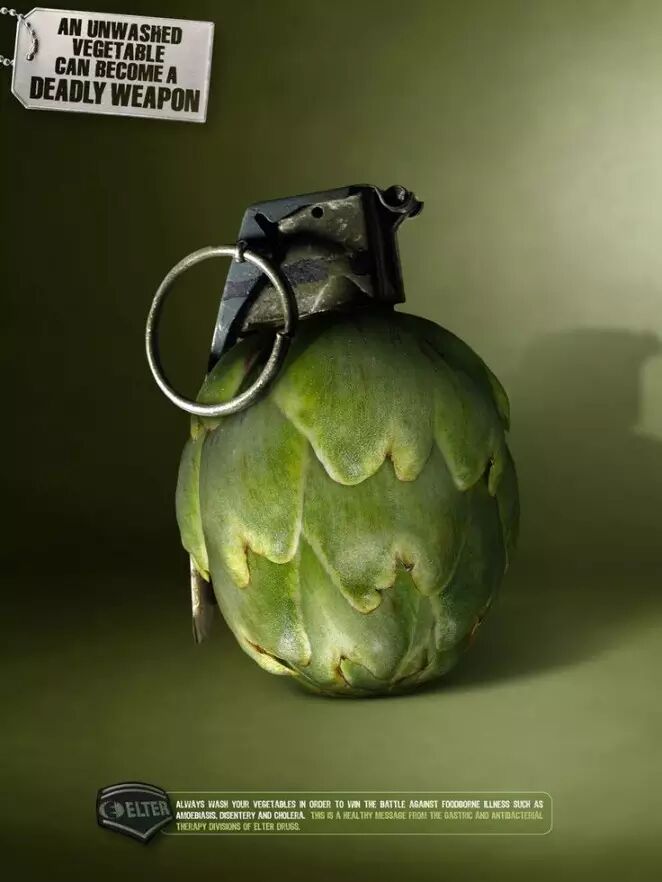 这个广告通过把一个未洗的洋蓟比喻成炸弹来警告公众食源性疾病的危害。 通过创建一个视觉比喻,Elter药业公司能够传达有关食品安全和Elter药物自己的抗菌治疗部门的强烈信息,而不显示任何敏感的图像。