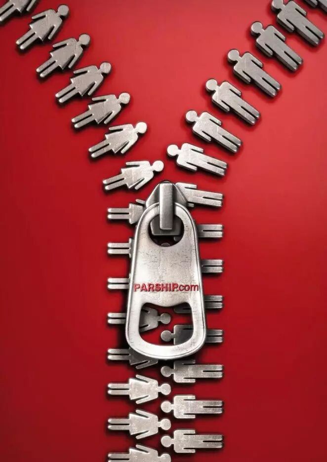这个广告是针对在线相亲服务网站——Parship.com设计的一个广告,它描绘了男人和女人被拉链拉在一起的符号。 在创作这个广告的过程中,设计师们会头脑风暴那些能够代表男性和女性(通卫生间符号)的符号和视觉,包括如何把两个符号拉在一起的想法(拉链)。
