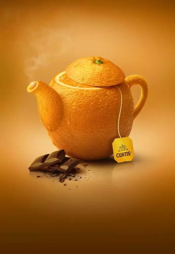 这个广告由柯蒂斯茶选择用视觉语言来展示他们的茶的香味和口感,而不是直接告诉顾客。 他们完全可以简单地在页面上添加一些文字说“这个茶拥有非常非常强烈的橙子香味”,但是他们选择通过将橙子变成茶壶的形状来传递以出他们的茶拥有非常强烈的橙子香味。