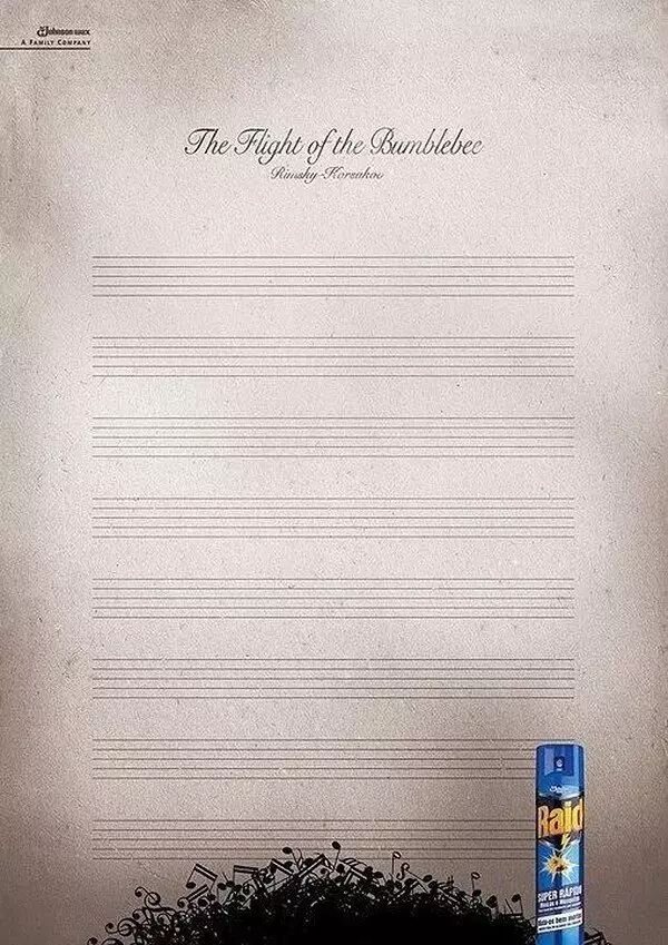 这个Raid杀虫剂的广告,用 产品“杀死”了著名音乐家——Rimsky-Korsakov谱写的“大黄蜂飞行”的音符(把音符比作扰人的蚊虫),意味着Raid杀虫剂足够强大,可以消除任何虫子。 这个广告看似很荒谬,但是这种如此明显的不真实会让人觉得搞笑,而不是欺骗或误导。