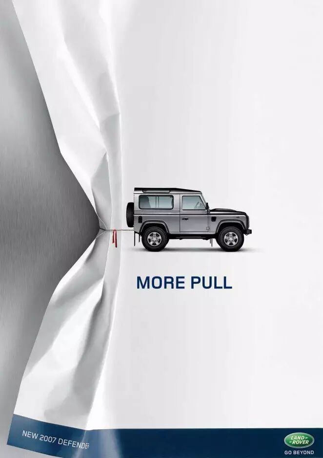 我们以路虎的这个广告为例,只使用两个字的文案和超强的视觉,制造出了一个吸引眼球的机智广告。 他们专注于汽车的一个特点。