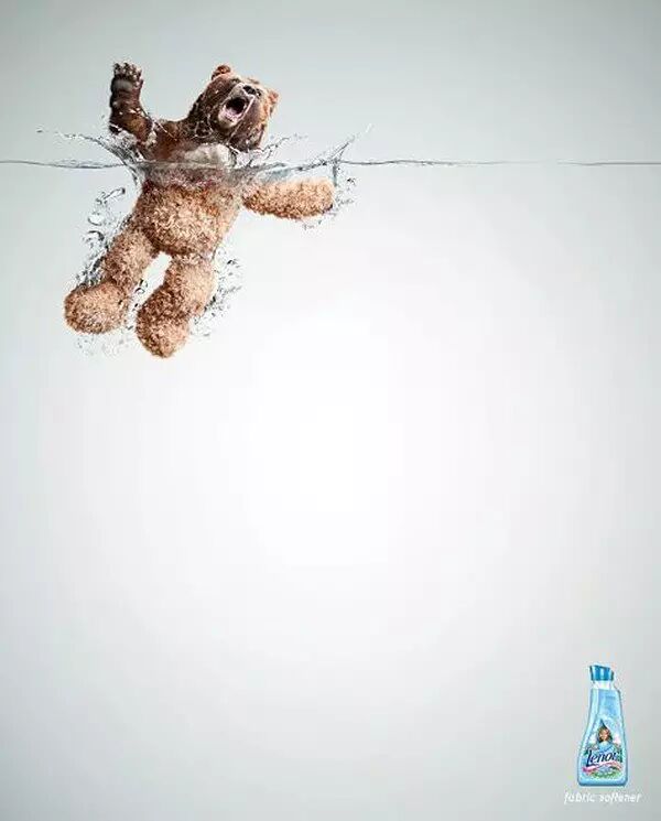 看看Lenor织物柔软剂的这则广告。 一种简单、强烈、巧妙的视觉效果有时候意味着不必添加文案。 这个作品让观众第一眼就看到焦点 - 熊变成泰迪 - 然后向下看到产品形象,只是广告内涵便不言而喻。