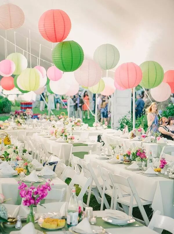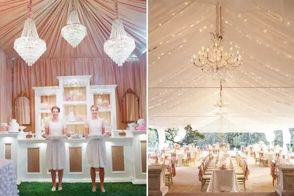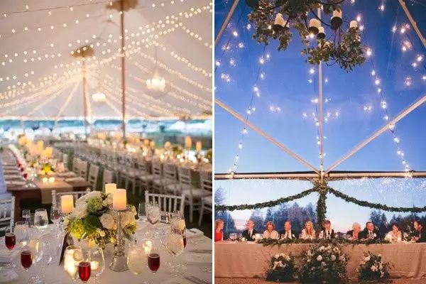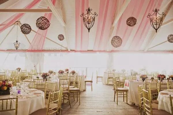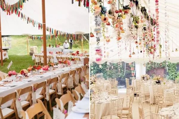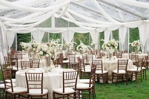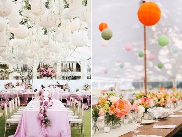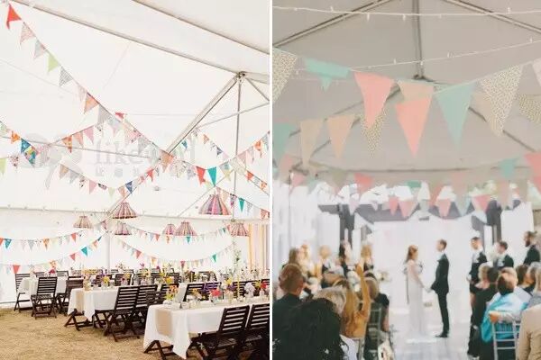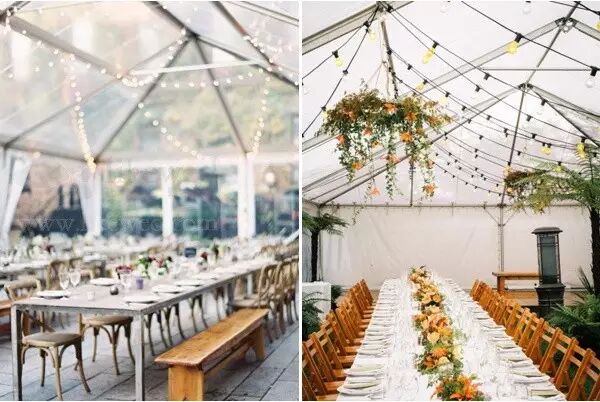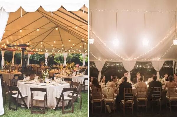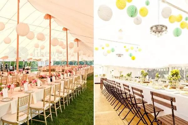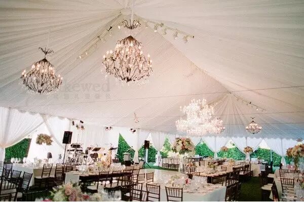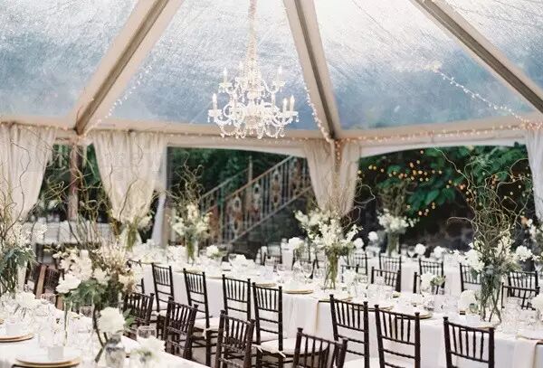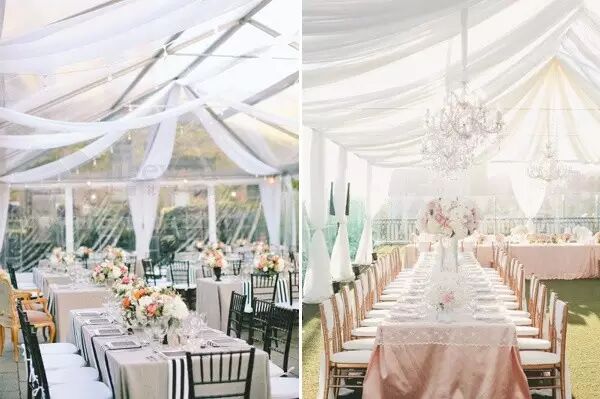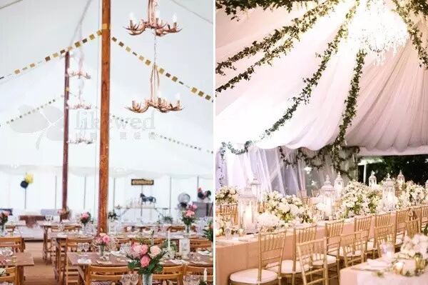 想拥有一个贴近大自然的户外婚礼,却又担心天气和气温的不稳定,帐篷婚礼是能让你同时欣赏户外美景和享受舒适室内空间的好方法! 为了让宾客在最温暖的环境下用餐,室内暖气和透明防雨篷都是欧美式婚礼帐篷的基本设备,可在雨天或寒冷的时候随时启动。除此之外,优秀的帐篷布置及设计更是能让场地在视觉上显得格外唯美浪漫。从天花板布幔设计、吊灯、灯笼、旗帜、花环,到迷你灯,让以下的创意帐篷布置带给你最浪漫的灵感。