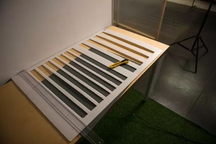 ▲ 首先,将一块纸板(这里是用泡沫板代替)割出一道道等距的缝隙。