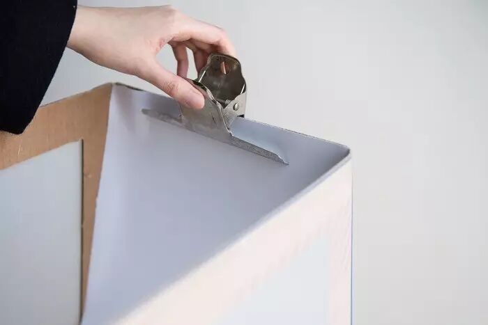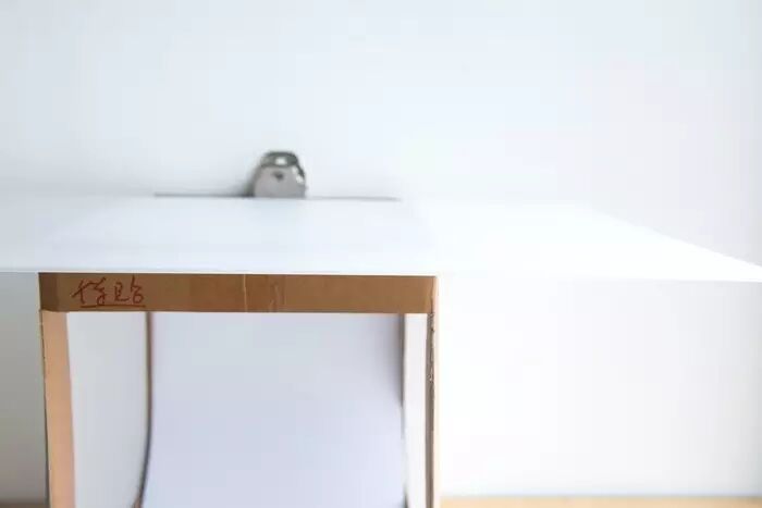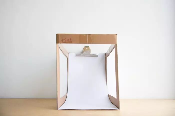 ▲ 准备一块宽度与纸箱相同的白纸,固定在纸箱上方。这张白纸会被用来当做这个迷你摄影棚的背景纸。