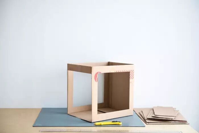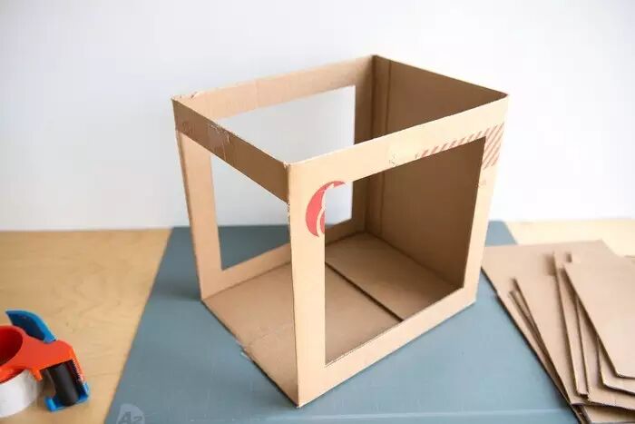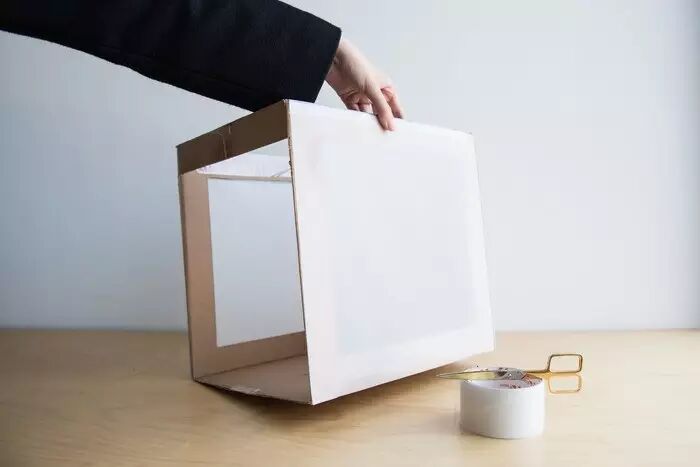 ▲ 首先,找一个大小适中(视你想拍的物品尺寸而定)的废弃纸箱,参考上图,割去左右两侧、正前方以及顶部的纸板。左右两侧各预留一部份边缘,等下用来粘贴拷贝纸。