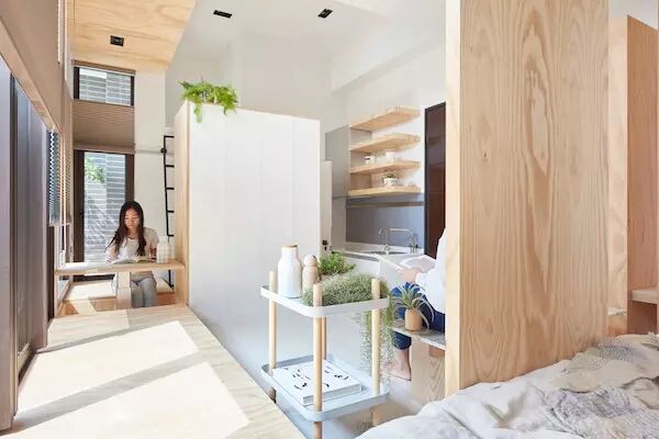小住宅空间设计,往往忽略了视野与景色的重要,更忘记怎样从小空间拿捏出最好的平衡。将多馀的设计除去,思考最重要的细节,才能让 10 坪住宅舒适与功能并重。摒弃小宅的传统夹层思考,改以高低的设计,让居住者从不同的视角互动感受空间,穿梭房子的木质长廊,串联空间也延伸机能,备有升降餐桌,也有贮物空间,餐桌旁较低的窗户设计,让整片通透的落地窗长廊,保有私密性,同时与户外维持着连结。细节如从主空间的木材质延伸卫浴的木纹砖,无不为这个迷你空间,带来最舒适的平衡与一致。