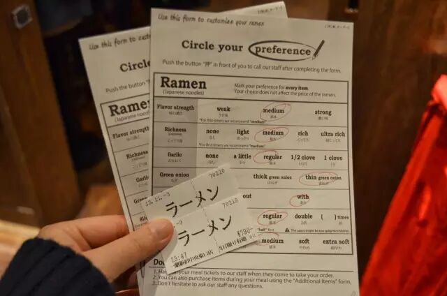 面条的硬度,汤头的浓郁度,要不要叉烧甚至是要青葱还是葱白,几倍的秘传将汁都要详细的用红笔勾选出来。