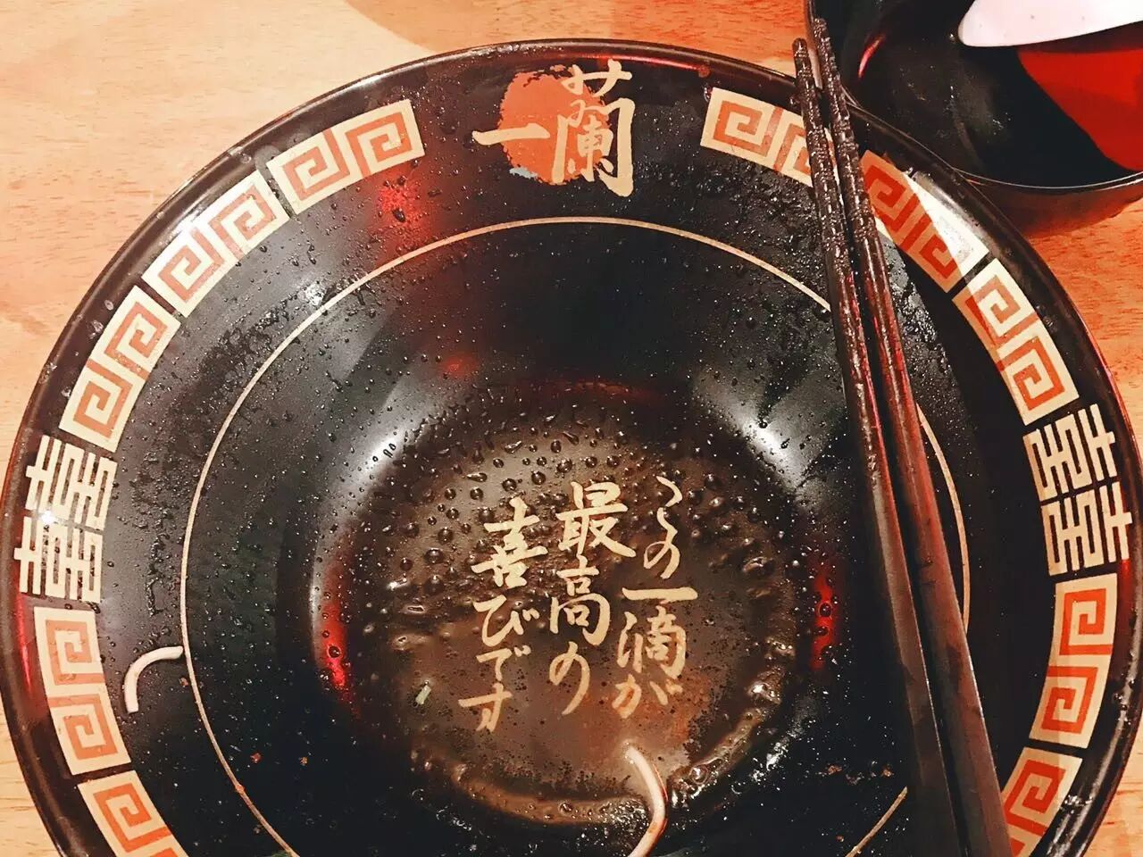 除此之外,很多美食攻略都提过,吃一蘭一定要把汤喝掉。这样你会看到碗底的“秘密”——この一滴が最高の喜びです。