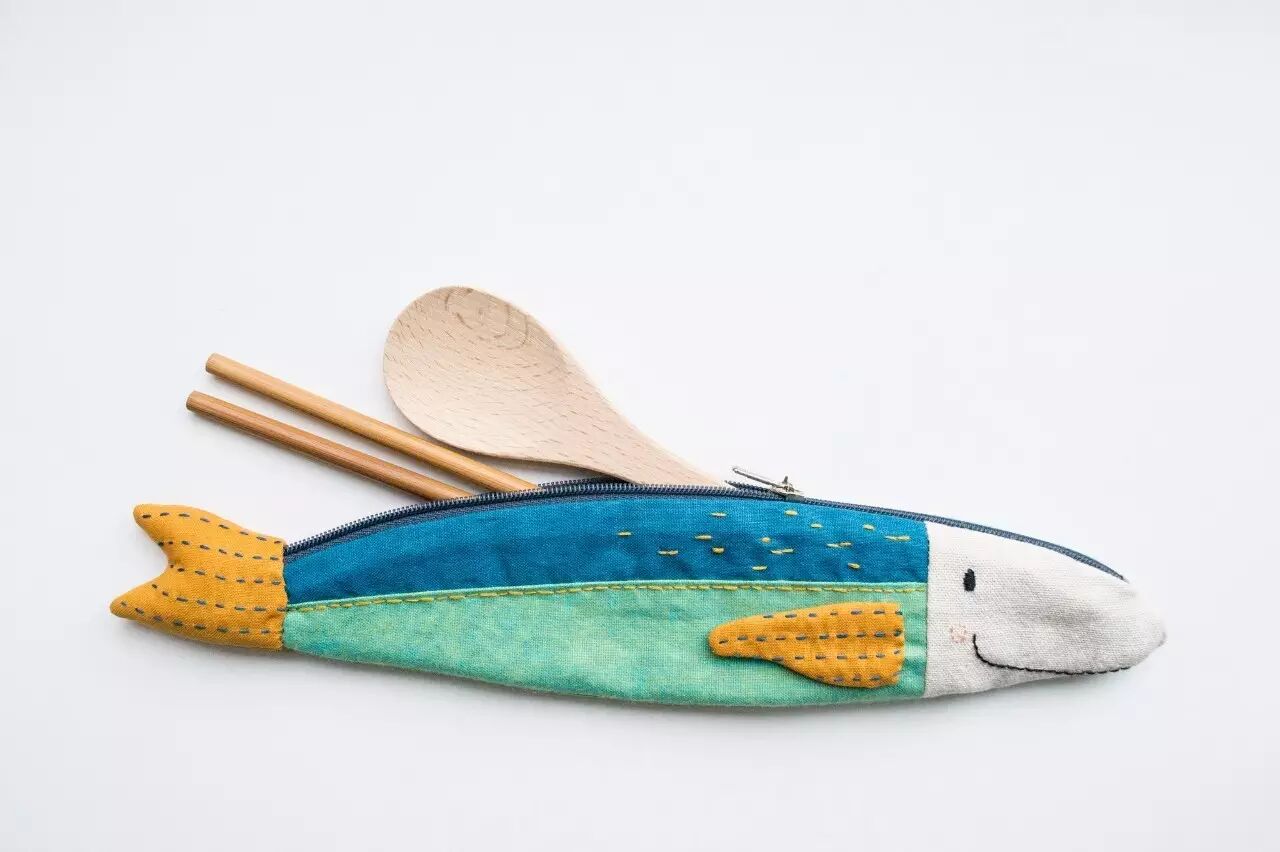 Momshoo 希望有了好看的餐具包,我们会更乐意把它们带在身边,减少使用一次性餐具,因为是手工刺绣,每条鱼嘴角微笑的弧度都不完全一样,可能会有傻笑鱼、微笑鱼(假笑鱼)。
