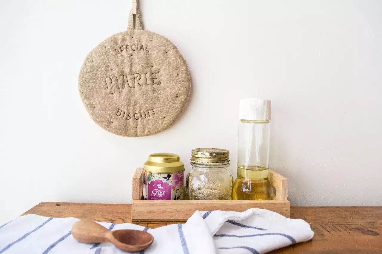 每个地方的玛丽饼干都不同,Momshoo 做的是新加坡口味的,用德国亚麻布配上刺绣字,挂在厨房真好看。