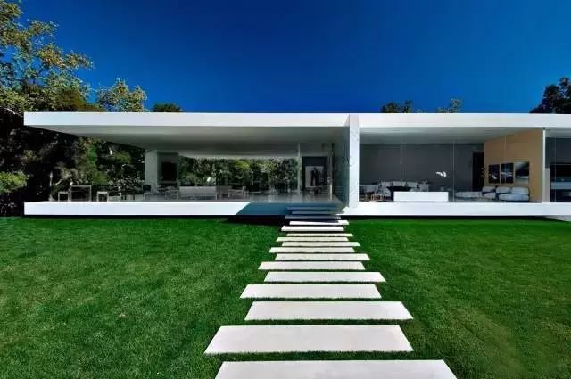 住宅的入口在一层,白色的步道从远处延伸过来,有种曲径通幽的味道。