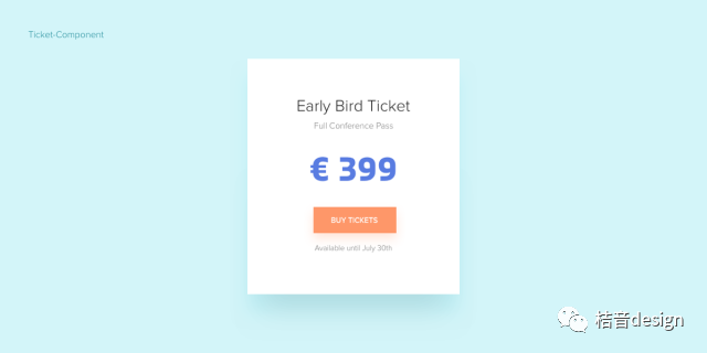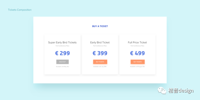 假设我们要给一些活动售卖3种不同的门票。每一张门票的表现的形式需要相同,它只包含了数量有限的元素,即一个按钮和几段文本内容。这就意味着一张门票即为一个组件:门票组件。