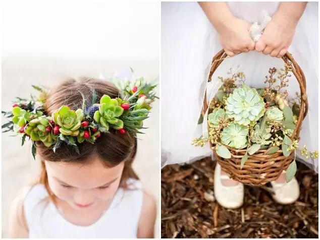 花童的头饰、花篮等,都可以加上多肉的装饰,清新翠绿的色彩和天真可爱的花童相得益彰。