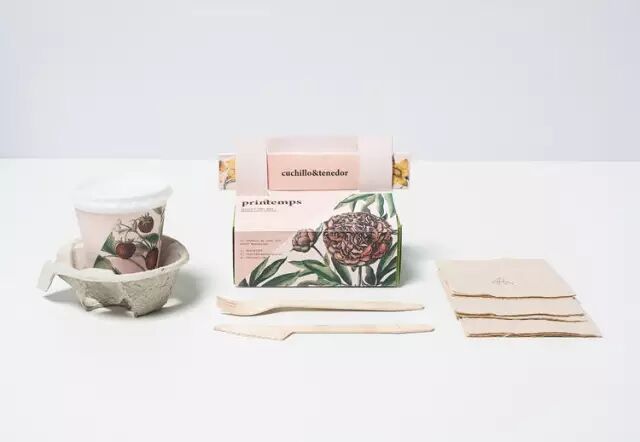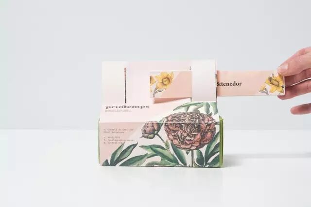 四季不变的外卖盒多少显得有些单调,在万物复苏的春天拎着 Printemps 的外卖盒走在路上,很有可能被误认为是刚去花店买了点什么。它是三位西班牙设计师为餐饮公司 Lateral 设计的春季限定版概念包装,配色以粉、白和绿色为主,配合像是植物图鉴般的插图,视觉效果相当舒适自然。