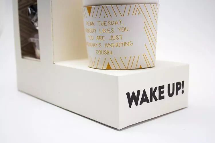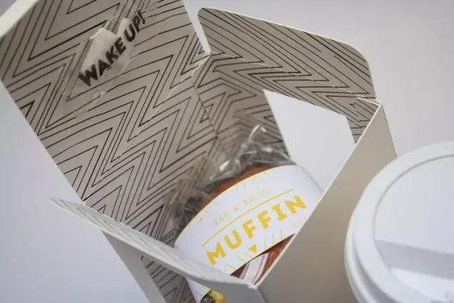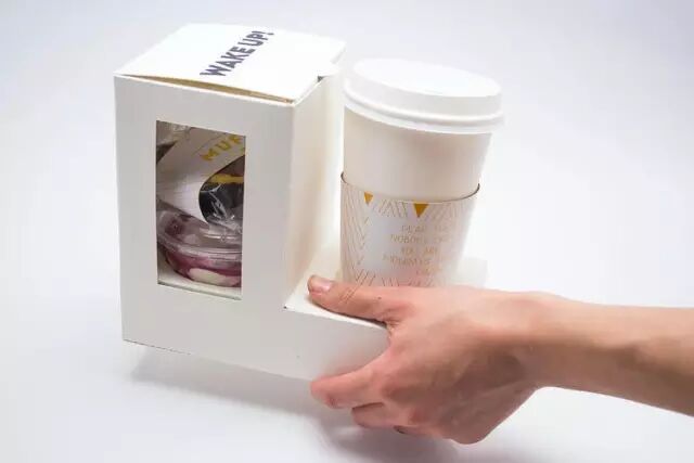 对于习惯在上班路上解决早餐问题的人来说,WAKE UP! 咖啡店提供的早餐盒可以满足你的需要。它本身是四位瑞典设计系学生为 2015 年 Packaging Impact Design Award(PIDA) 设计的一个概念品牌包装,外形从侧面看就像是躺在地上的字母 P,单手就能掌握。盒子的前半部分可以容纳主食和酸奶盒,后半部分既充当了把手的功能,又能放上一杯咖啡。