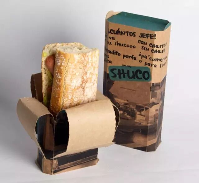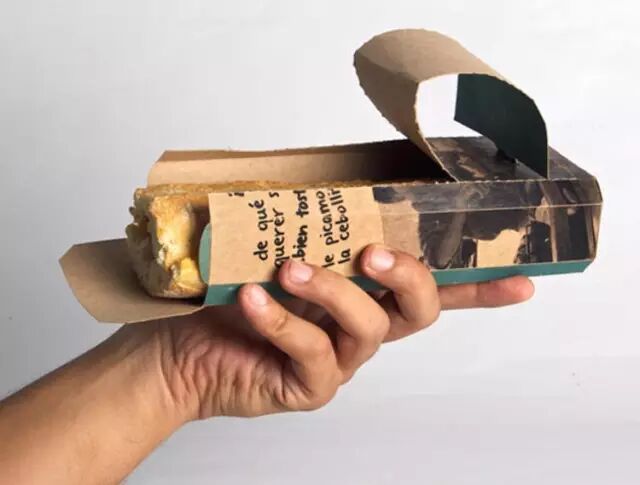 吃热狗这种街头美食时免不了会显得有些狼狈,来自危地马拉的 Ana Gabriela Castañeda Solano 为此设计了一款可以两用的包装盒。只要沿着预先设计好的折线将纸盒四周撕开,碎屑和酱汁就不会像平时那样把手弄脏了。