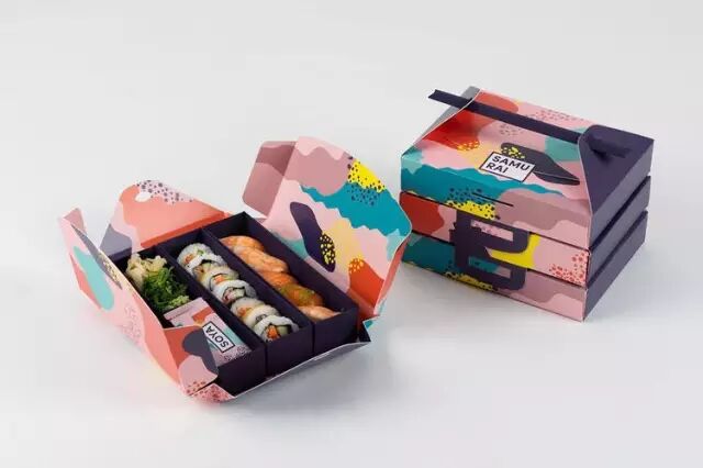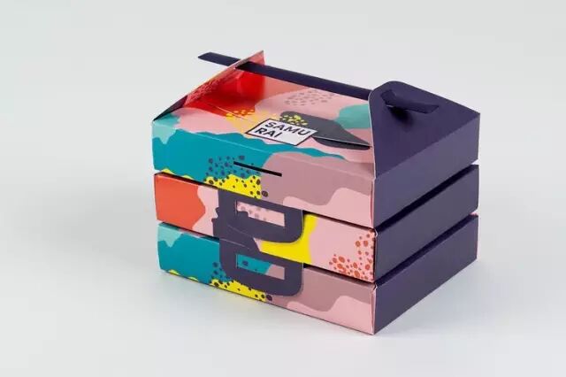 Samurai 是瑞典斯德歌尔摩的一家日本餐厅,三位设计系学生受邀为其重新设计了一套色彩斑斓的视觉形象。以“无胶包装”为核心打造的外卖盒通过印有餐厅 LOGO 的粘纸封装,盒底有两个可以掀起的插销,能够像便当盒一样堆叠在一起,附赠的筷子穿过盒子预留的小洞就变成了提手。
