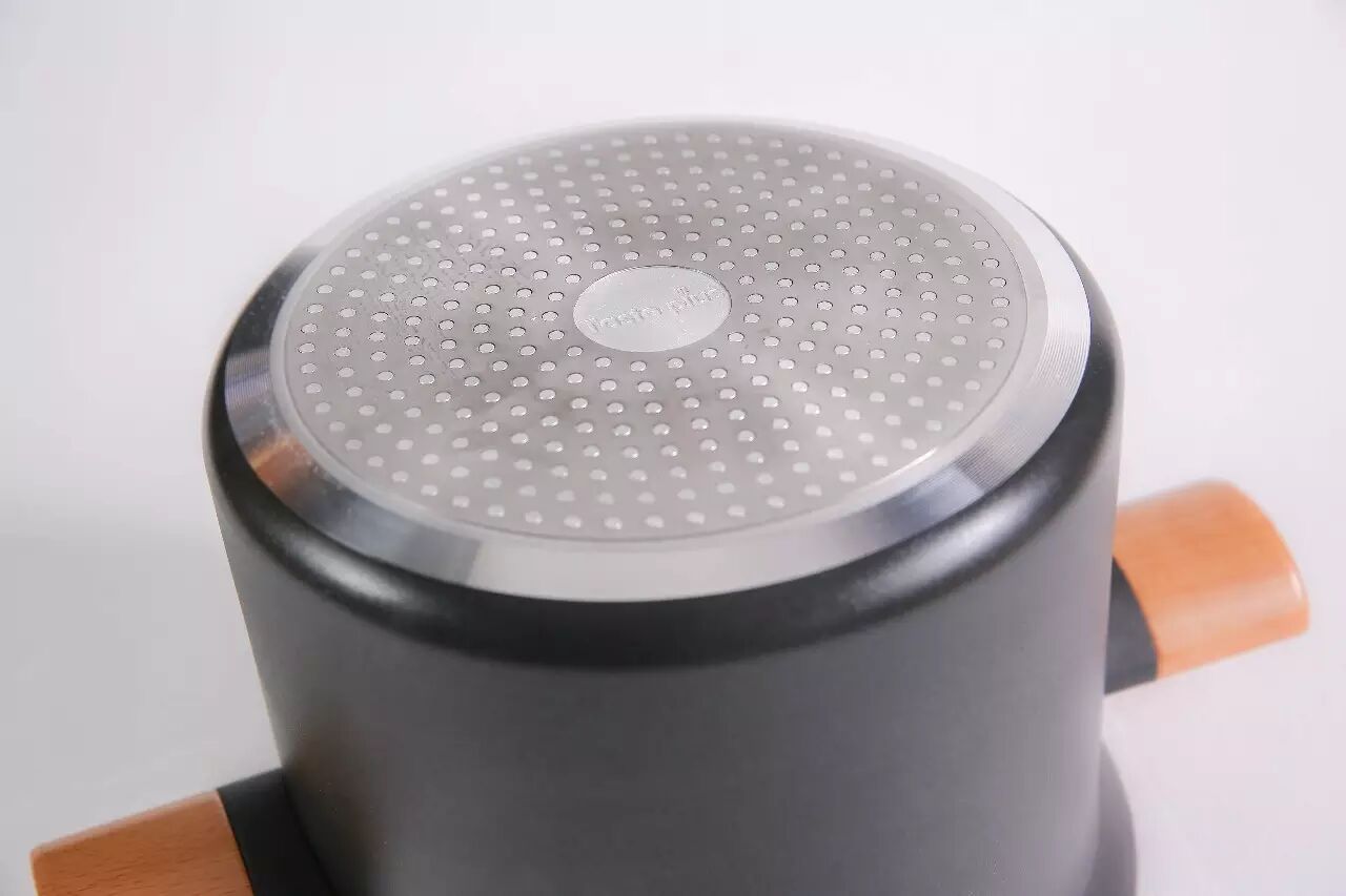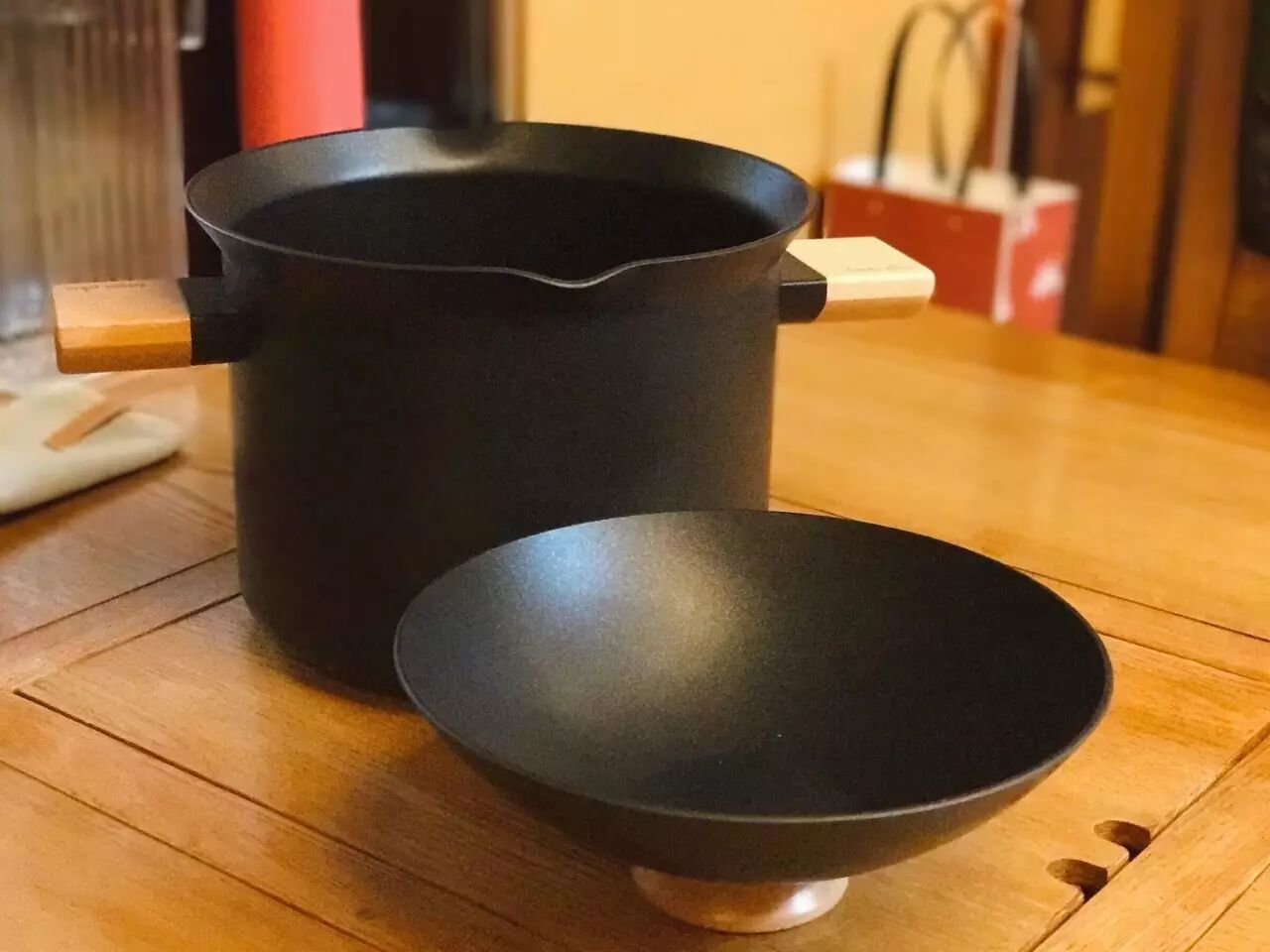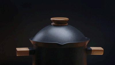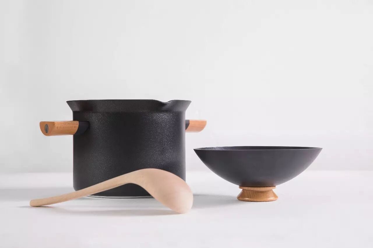 锅盖和锅体把手用榉木原木点缀。