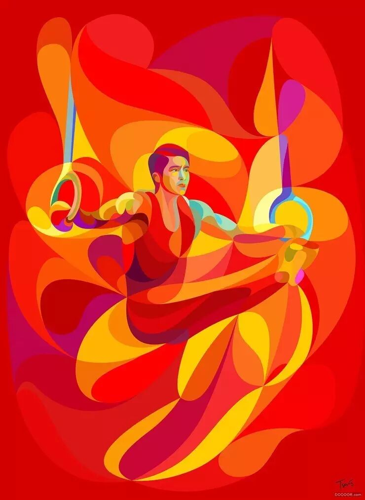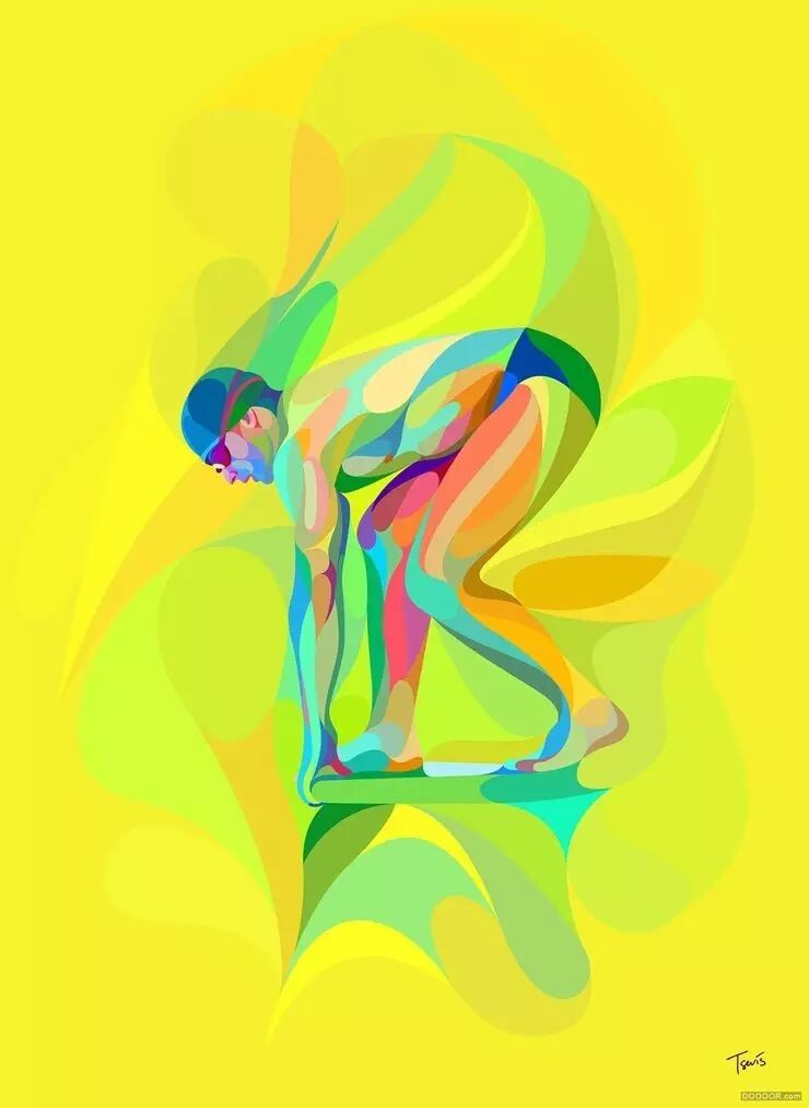 跳水、游泳运动员的身形用了柔和的曲线形式