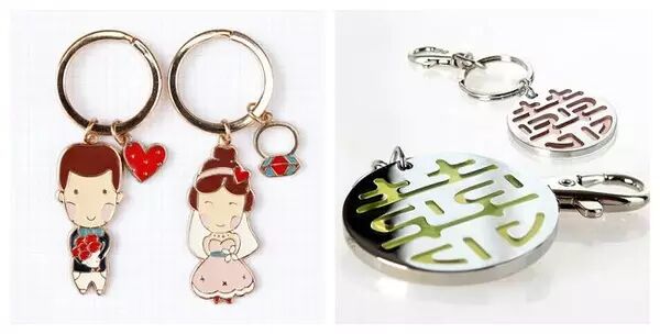 定制钥匙扣最好是卡通的,送给客人一份独特的婚礼记忆。钥匙扣有金属、木头,亚克力等多种材质可供挑选,还可选择在背后刻字以纪念婚礼。