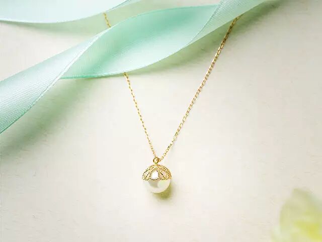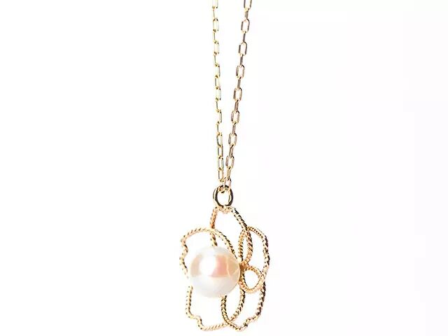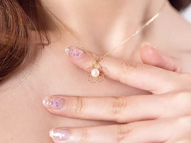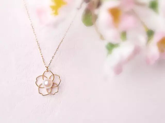这款珍珠项链灵感来自樱花,用10K金精细加工弯曲出5片心形花瓣,柔美地簇拥成一朵绽放的樱花。