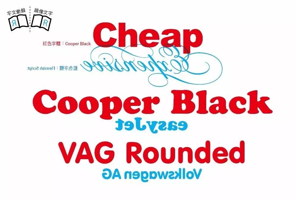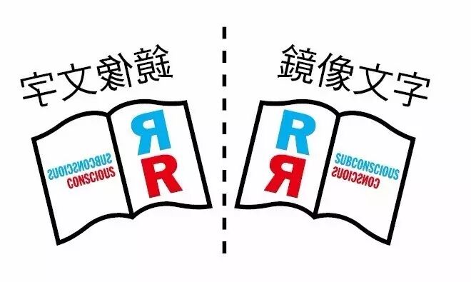 你可以选择何时要开始注意到字型本身传递的讯息。下图的红字写出字体的名称,蓝字则是据称可直接和潜意识脑沟通的「镜像文字」。把书拿到镜子前面,就可看出蓝字的字句。