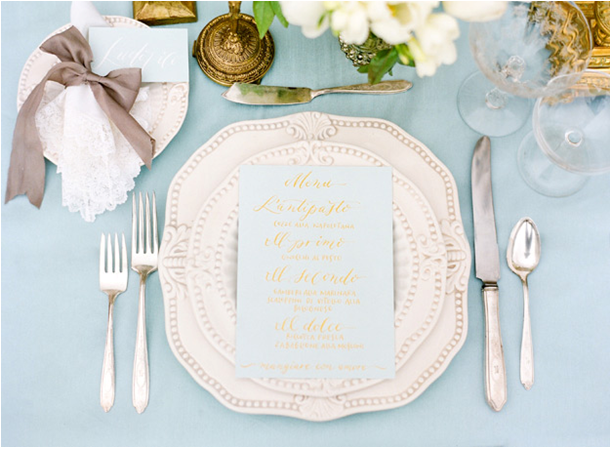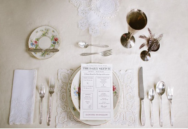 在盘子上放入菜单是很礼貌的做法,并且,菜单好像莫名有种会增大别人食欲的功效,你一定也期待每一位宾客都对你的婚宴蠢蠢欲动。好的菜单排版会直接影响到你的餐桌视觉,不求华贵也一定要简单大方。当你安排好一切,就能独自享受揭开谜底的快感了。