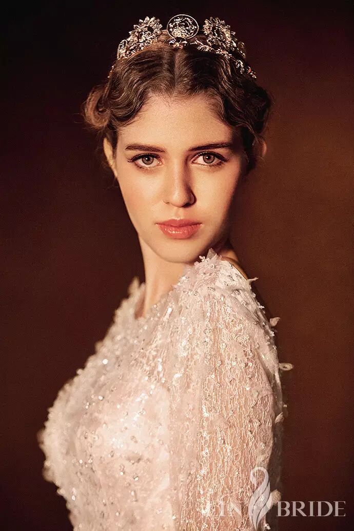 妆容淡雅,皮肤白皙,这组片子中选用了浅金棕色眼影,粉桔色腮红和唇,突出健康光泽质感。造型方面以曲线为主,再加上复古色调,整体展现出罗马风格的华丽古典。