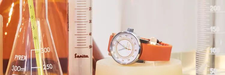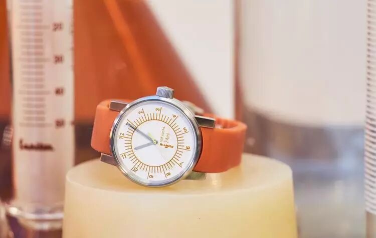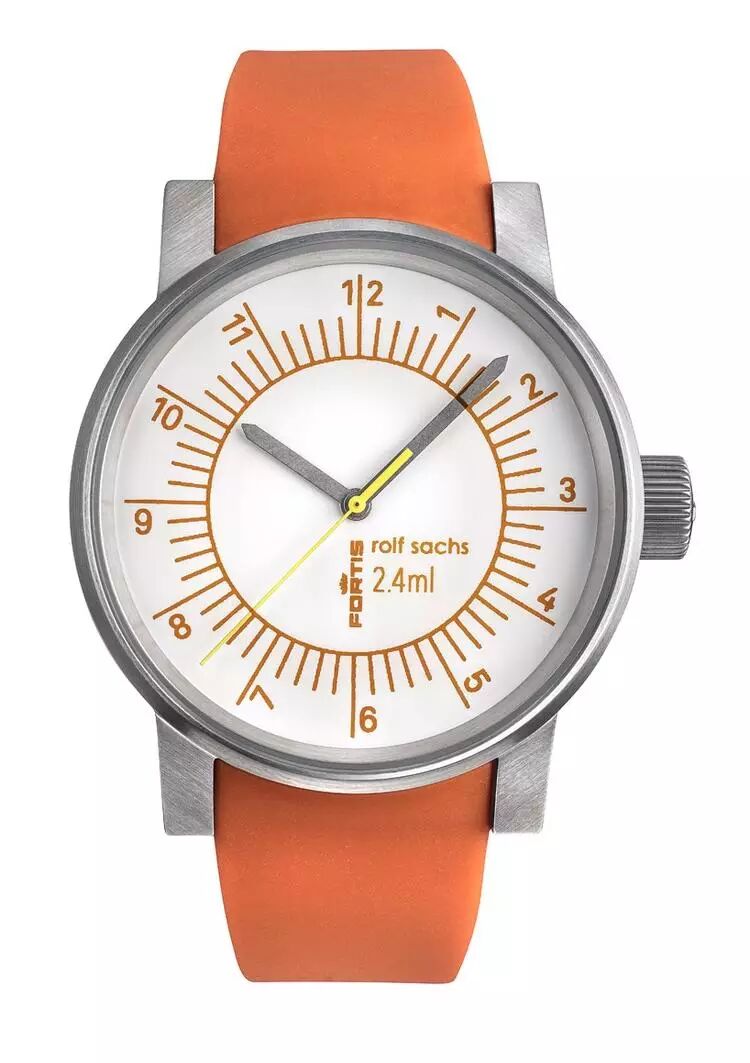 还记得实验课上使用的那些测量仪器吗?最近,擅长跨领域设计的艺术家 Rolf Sachs 就以化学实验室中的视觉元素为灵感,为英国手表品牌 Fortis 打造了一块名为 2.4ml 的腕表。为了效仿测量仪器的表盘,表面上橙色的刻度特意采用了手工绘制配合高温定色的加工方法,透露出一种低调的工业美感,2.4ml 则得名于玻璃表面和表盘之间的空气含量。