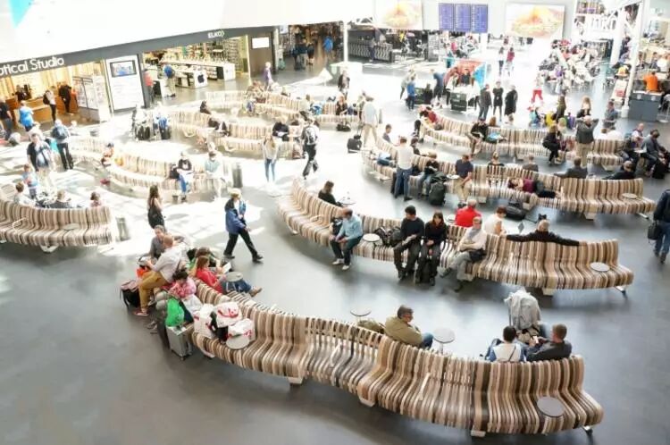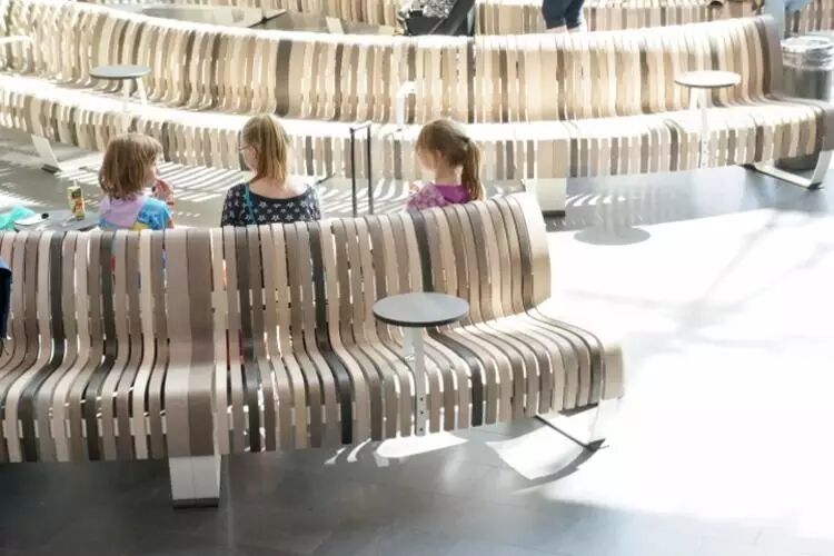 候机区域的椅子并不只有一板一眼而且看起来黑压压连成一片的那种。在冰岛的凯夫拉维克国际机场(Keflavik International Airport)一块 400 平方米左右的候机区域,由瑞典家具公司 Green Furniture Concept 设计的 Nova C 系列座椅用它们优雅的曲线欢迎旅人们在此稍作歇息。Nova C 由 8 条让人联想到海浪的焦糖色长椅构成,240 个座位通过附带的边桌和白色的扶手隔开,看上去随性又美观。
