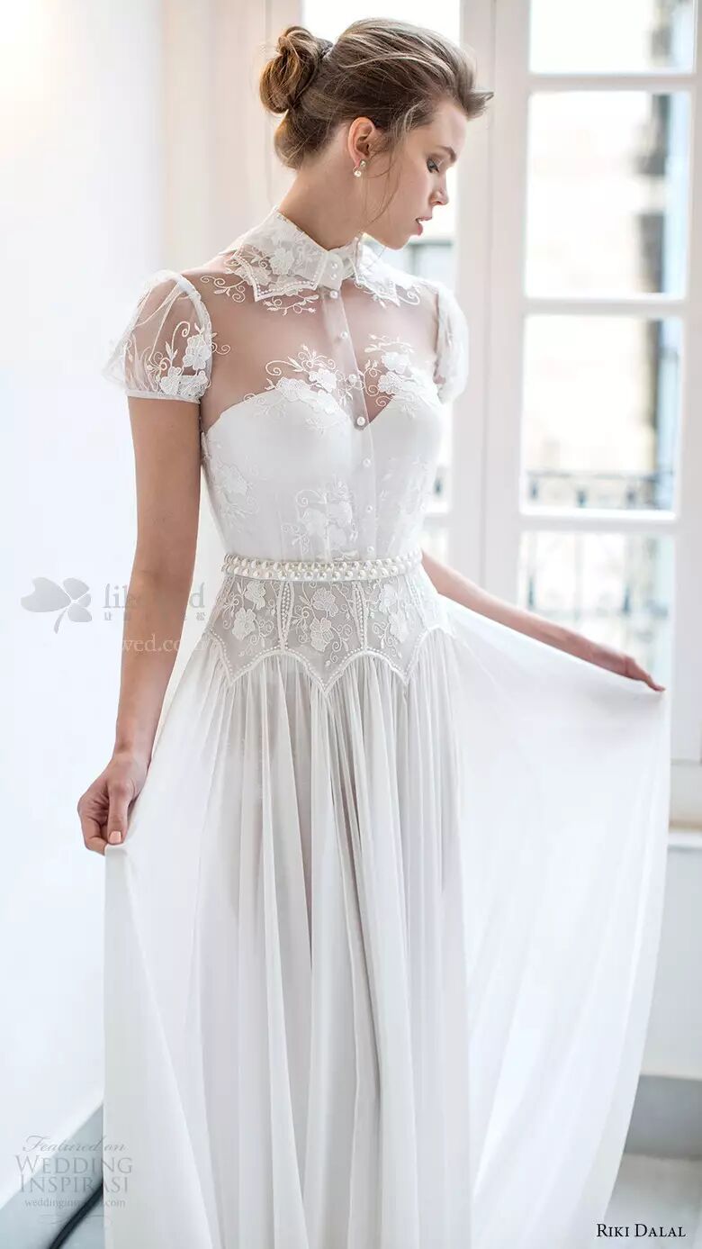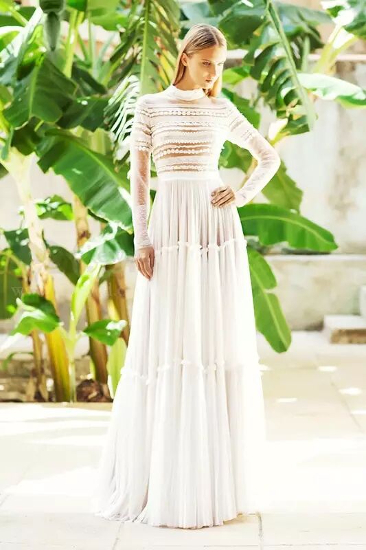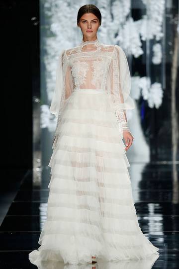 Yolan Cris 这款婚纱采用高领搭配灯笼袖, 在透明薄纱上饰以蕾丝和图腾装饰,细腻浪漫。 轻薄蛋糕裙为对下半身不自信的新娘轻松营造超级大长腿。