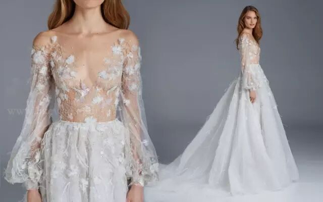 在2017春夏纽约婚纱礼服发布会中,我们可以发现透视与镂空依然是设计主流。