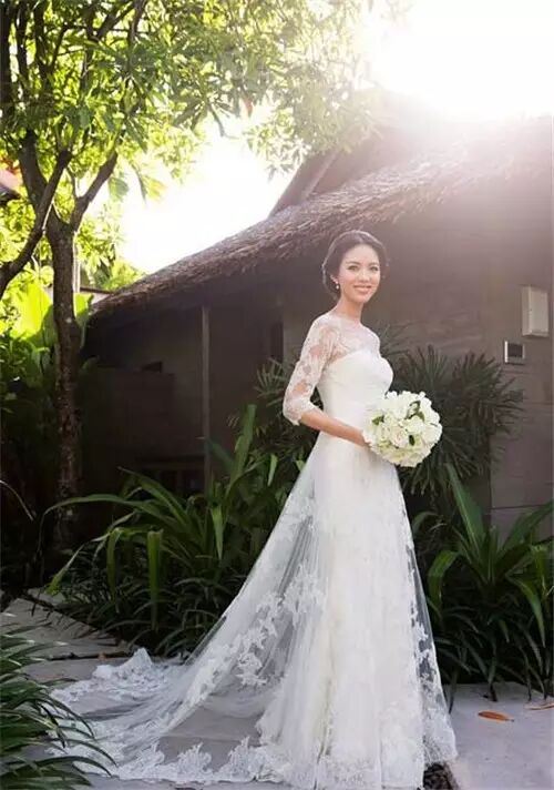 身材高挑的张梓琳穿上透视蕾丝长裙,配以淑女新娘盘发,气质非凡。