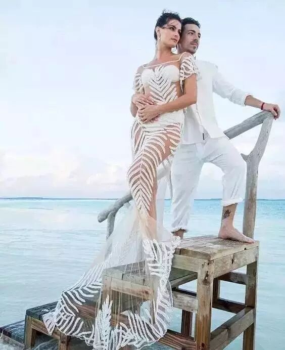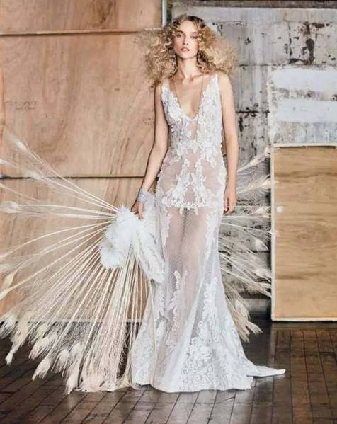 美美的透视婚纱,既可以仙美得不食人间烟火,又可以美艳不可方物;无论是半透明纱质面料露出光洁的肌肤,还是高至大腿根部的开叉裙摆……