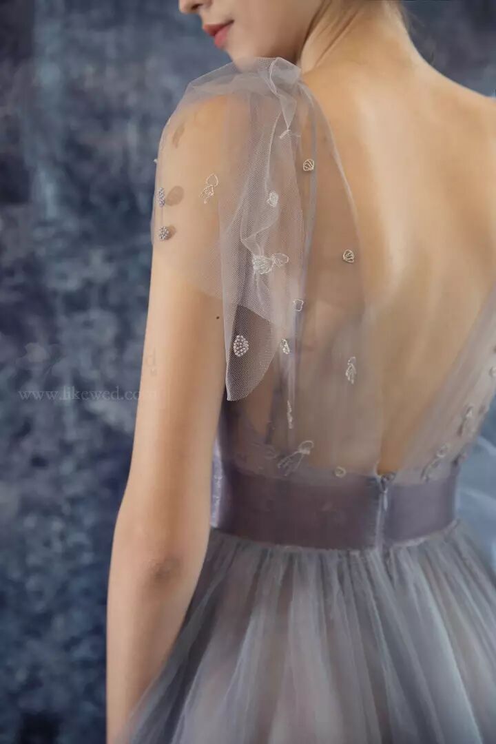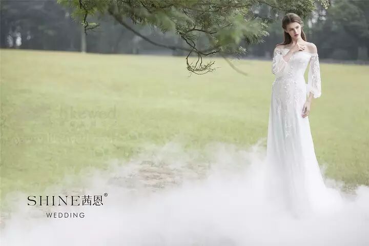 茜恩这款婚纱用白纱打造轻薄的透视感,美得如梦似幻。