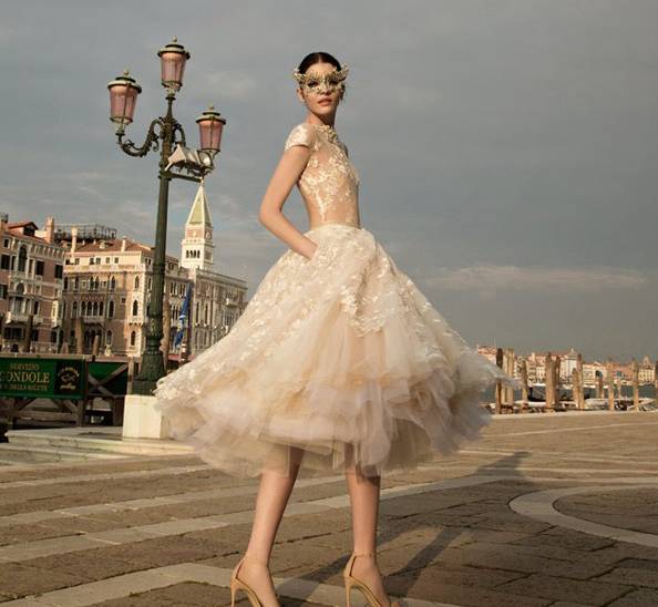 Atelier Pronovias这条美裙使用了大量精致华丽的蕾丝,并以曲线形透视薄纱展现女性姣好的身段,新颖独特,非常适合举办浓重婚礼仪式的时候穿着。