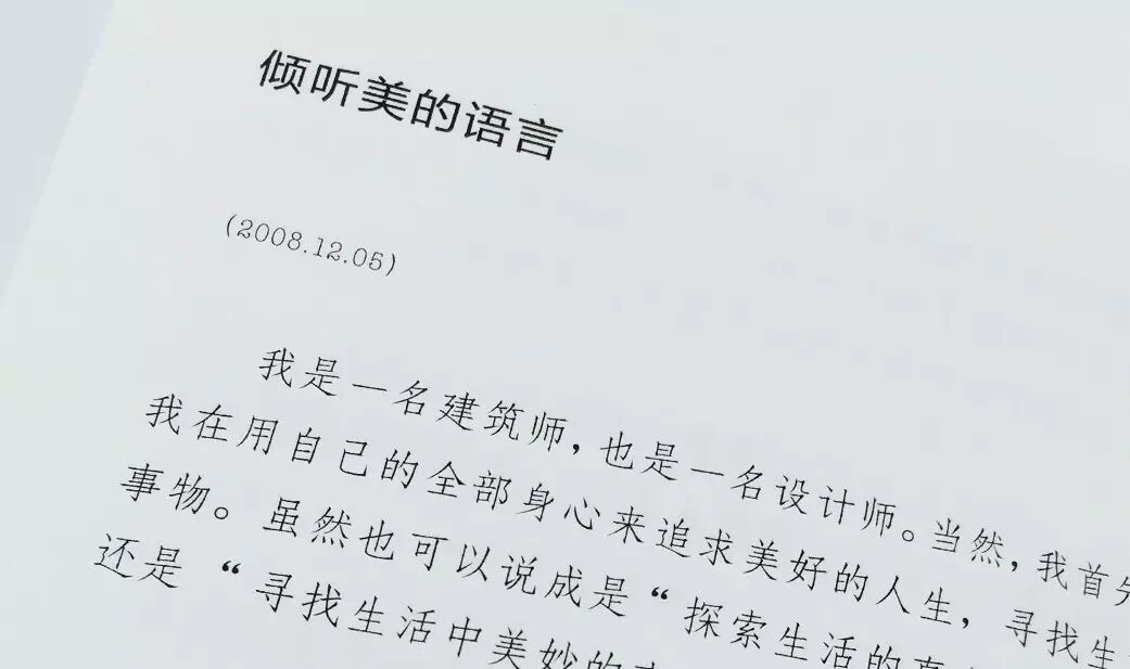 - 我是一名建筑师,也是一名设计师。当然,我首先是一个人,我在用自己的全部身心来追求美好的人生,寻找生活中美妙的事物。为了寻找“美的事物”,我不会虚度年华,而是在从事建筑设计、产品设计。虽然可以说设计是思想的表现,但在此之前,设计应该是对美的探索。设计不仅仅能够变现已发现的东西,还能作为探索的手段。