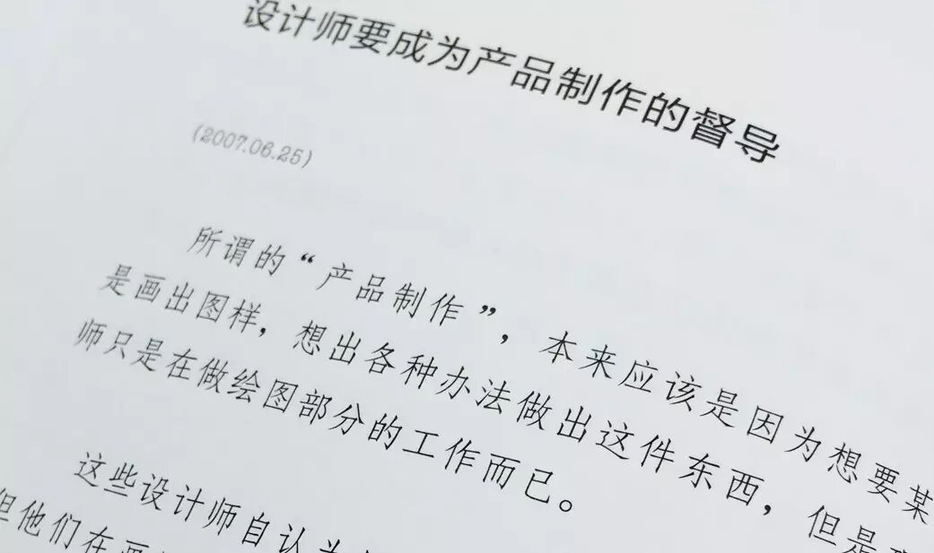 - 所谓的“产品制作”,本来应该是因为想要某个东西,由于画出图样,想出各种办法做出这件东西,但是现在很多设计师只是在做绘图部分的工作而已。生产只要和销售连在一起,就要对设计、生产和销售进行综合判断,因此设计也常常不被采用。简而言之,就会出现以下的言论,“如果不这样,就卖不出去”,“如果不这么修改一下,产品价格就会提高,就会卖不出去”。对于所有这些过程,到底有没有能够对其全部负责的人呢?设计师实际上应该担负起这个责任,可是在现实的生产组织结构中,并不是这样的。虽然造成现在这种情况的原因很多,但是最大的原因还是设计师本身。设计师对整个生产过程负责的意识很低,要想负起责任,就要具备这方面的能力。这就需要设计师具有将民众的需求作为自己的需求进行把握的能力;具有了解民众的购买动机及贩卖市场的结构,并进行企划的能力;具有控制价格成本的同时理解生产者的技术和精神,并完成产品的整个生产过程的能力。