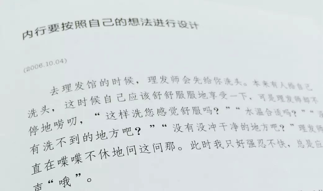 - 去理发店的时候,理发师会先给你洗头。本来有人给自己洗头,这时候自己应该舒舒服服地享受一下,可是理发师却不停地唠叨,“这样洗您感觉舒服吗?”“水温合适吗?”“没有吸不到的地方吧?”“有没有没冲到的地方?”理发师一直在喋喋不休地问这问那。此时我只好强忍不快,总是应付一声“哦”。水温到底多少才合适,经常给客人洗头自然能知道。如果理发师连头发洗没洗干净,冲没冲干净都不知道,那就太差劲儿了。不问客户就能果断决定应该怎么做,这才是内行。如果你是内行,就一定会要有自己的见解。内行要按照自己的想法去设计。只有那些自己没有想法的人才会看上去和蔼可亲,虚心听取客户意见。因为他们没有自信,所以才会去问别人。他们觉得只要听了别人的意见,自己就不会有什么责任,因此也就会倍感安慰。